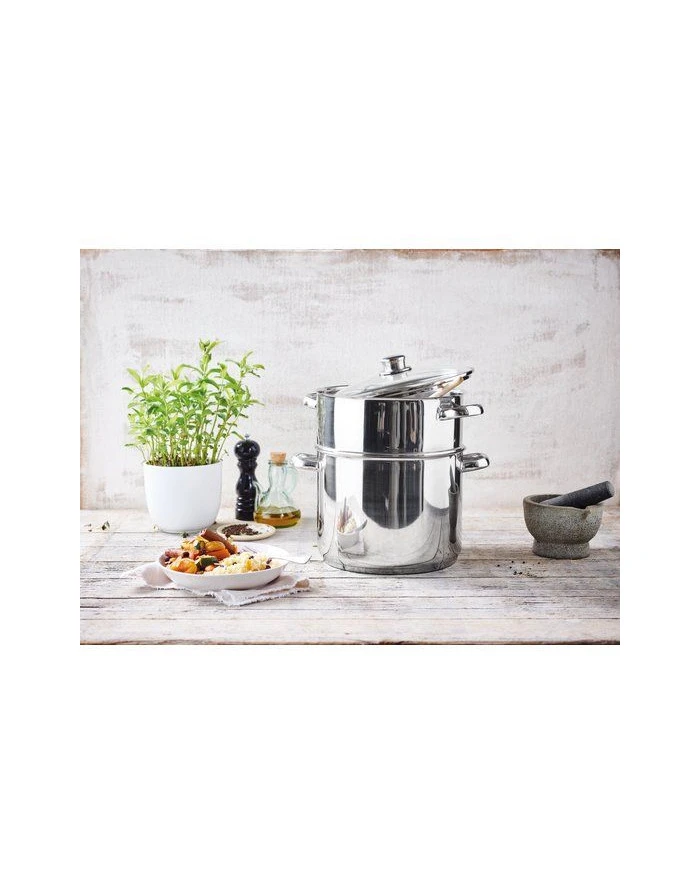 Régalez vos convives avec un excellent couscous avec ce couscoussier Chambord de BEKA. Disponible en 26 et 28 cm de diamètre, cet ustensile est en inox.. Pratique pour cuisiner ce plat exotique, le compartiment du haut est parfait pour la cuisson de la semoule de couscous à la vapeur. Le compartiment du bas, la marmite, sert à préparer le bouillon de légumes et de viandes.
