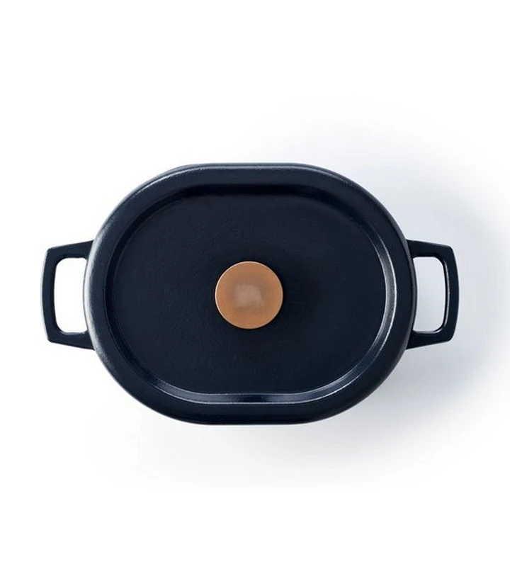 15141314 – daubière en fonte émaillée 31cm noir – Daubière Nori Beka 15141314 en fonte émaillée avec triple fonte émaillée intérieur et extérieur : bonne répartition de la chaleur. Cette cocotte en fonte avec bouton de couleur bronze ne passera pas inaperçue dans votre cuisine et sur votre table. La fonte est un matériau durable, qui diffuse et préserve la chaleur de façon optimale. Cette forme rovale unique (ni ronde ni ovale) offre une capacité allant jusqu’à 5,5 litres. La fonte émaillée est directement prête à l’emploi. Elle est parfaite pour dorer, mijoter, caraméliser et idéale pour cuire au four. La finition épaisse en émail résiste aux rayures et facilite grandement le nettoyage et l’entretien de la cocotte. Le fond permet d’éviter les rayures sur votre plaque de cuisson et votre plan de travail. Grâce aux picots sous le couvercle, le jus de cuisson qui s’évapore est récupéré de manière optimale pour se répartir uniformément sur les aliments. Cet arrosage naturel et continu, permet aux viandes de rester tendres, aux légumes de garder leur moelleux et les saveurs sont préservées. – Type de produit : Cocotte.