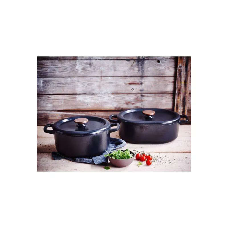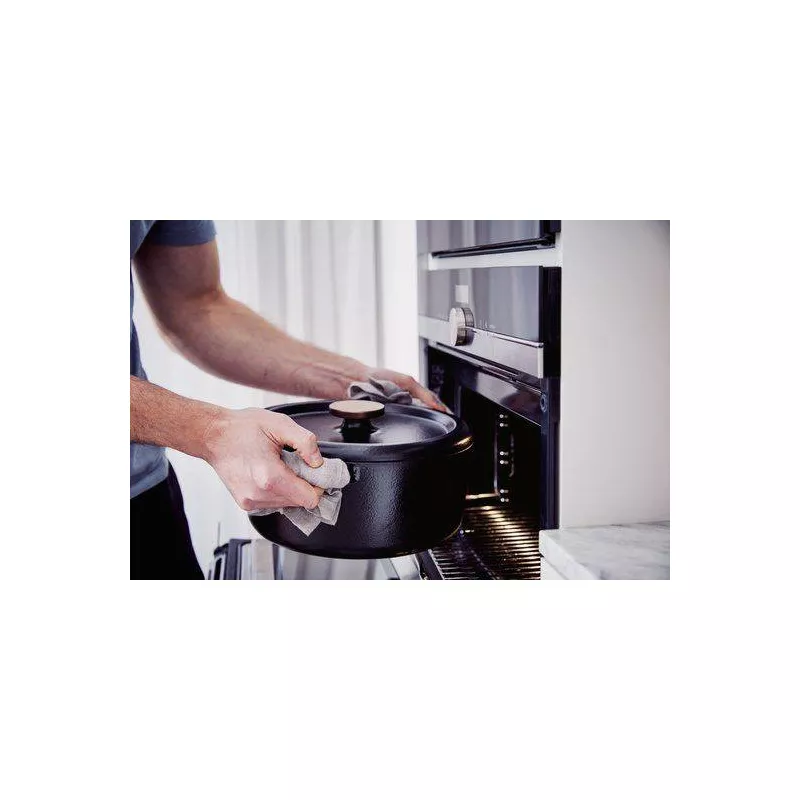La fonte émaillée est prête à l’emploi. La finition vitrifiée intérieure résiste aux rayures et facilite le nettoyage et l’entretien de la cocotte.