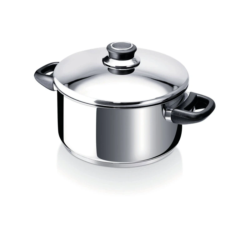 - Caractéristiques – Matériaux : Acier inoxydable 18/10e Finition Poli Miroir Equipement isolant en bakéliteCuisson tous feux et Induction