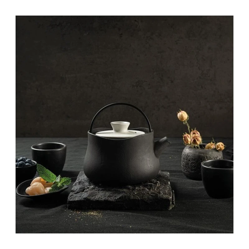 16400144 – théière en fonte 1l noir – Design unique inspiré des théières traditionnelles Japonaises, cette théière Tetsubin Beka 16400144 est le parfait équilibre entre l’esthétique, la fonctionnalité et le matériau. Inclus un tamis à thé extra-fin en acier inoxydable : Les feuilles de thé en vrac finement coupées ne peuvent pas s’échapper. Le bec verseur intelligemment conçu permet un versement facile. La base large permet d’utiliser la théière sur tous les feux y compris l’induction. L’eau peut être chauffée à feu doux ou moyen avant de rajouter le thé. Corps en fonte noire avec large base, idéal pour maintenir votre thé à température. Couvercle en porcelaine avec trou de ventilation sur le dessus : L’arôme du thé frais se diffuse subtilement à travers l’orifice. En combinant Fonte et porcelaine, il y a très peu de perte de chaleur. La poignée se replie entièrement pour un rangement plus facile et un gain de place. – Type de produit : Théière.